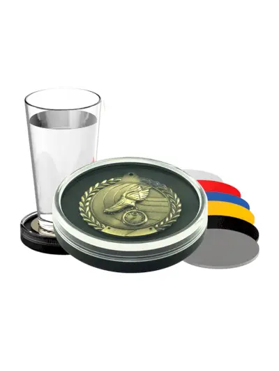 El Kudos Coaster Plus tiene una parte superior transparente a presión, un forro de espuma de varios colores en el interior y un borde elevado para mantener a raya la condensación. Puedes cortar la cinta o meterla debajo antes de encerrar la medalla en el interior.